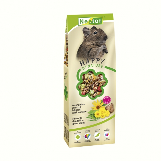 HAPPY BY NATURE – idealnie dopasowany i zbilansowany pokarm klasy PREMIUM z topinamburem, mniszkiem lekarskim i nasionami traw, został specjalnie przygotowany z myślą o koszatniczkach. Mieszanka pozbawiona sztucznych składników, barwników, konserwantów, starannie dobrana zgodnie z potrzebami i wymaganiami żywieniowymi koszatniczek, z siłą płynącą wprost z serca natury wspomaga ich zdrowie, kondycję i dobre samopoczucie.